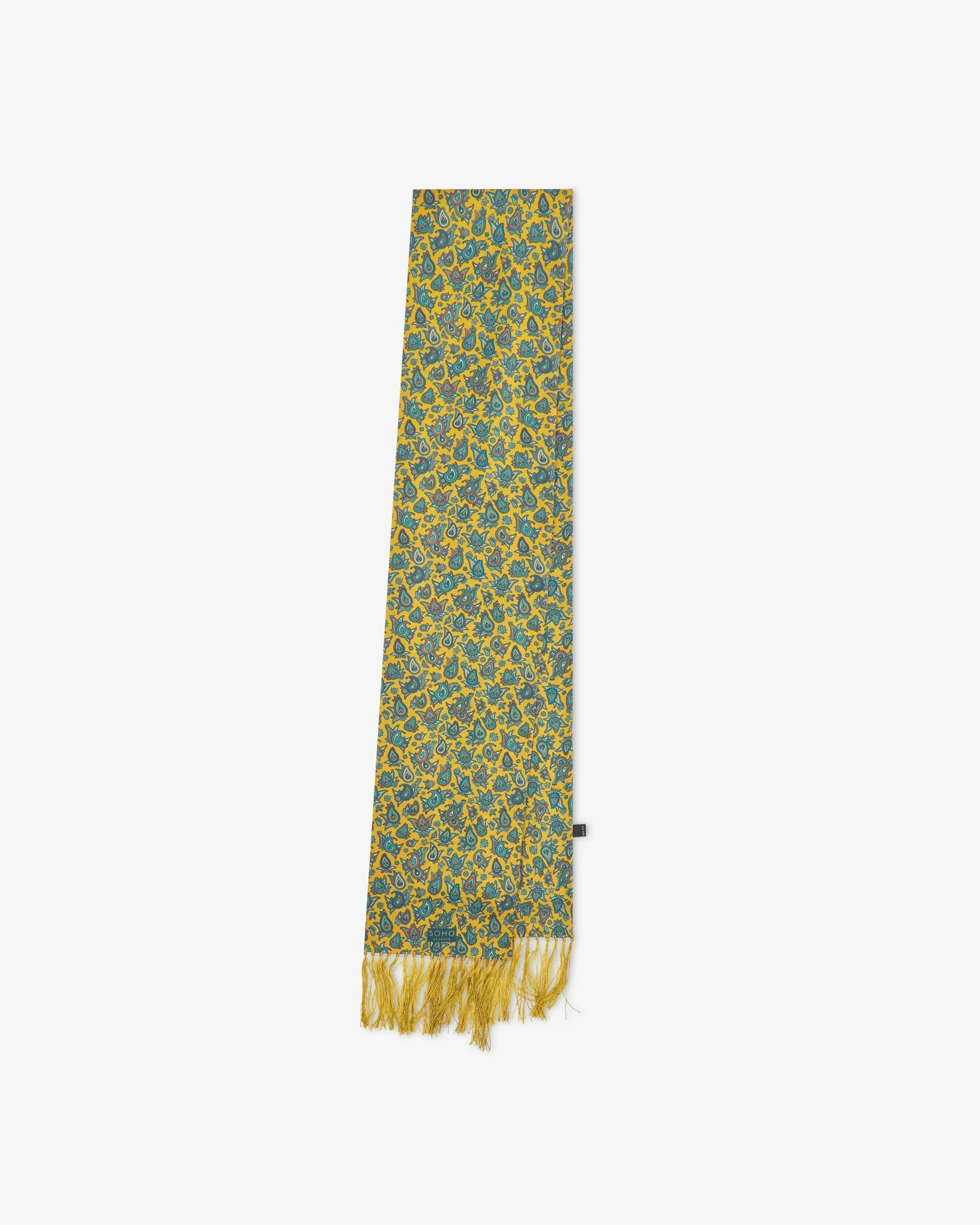 Introducing 'The Buttermere' for men, a premium 100% silk aviator scarf that exudes both elegance and boldness. This scarf showcases small paisley motifs in shades of blue, blue-green, orange, and yellow, set against a vibrant gold background.