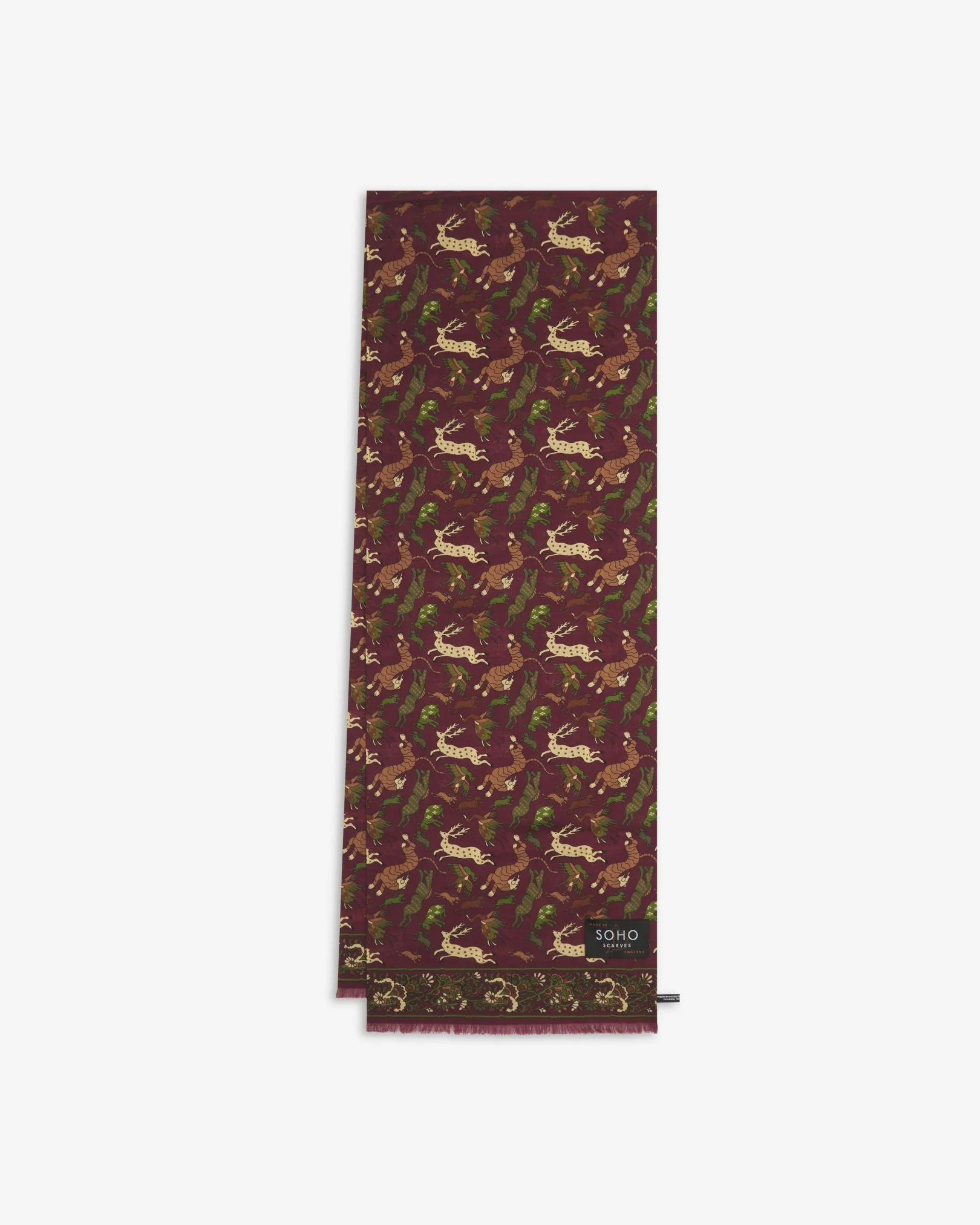 The meticulous production process of the ‘Woodland Creatures’ scarf achieves an immaculately detailed burgundy, brown and green design, combining woodland creature motifs and floral border decoration.