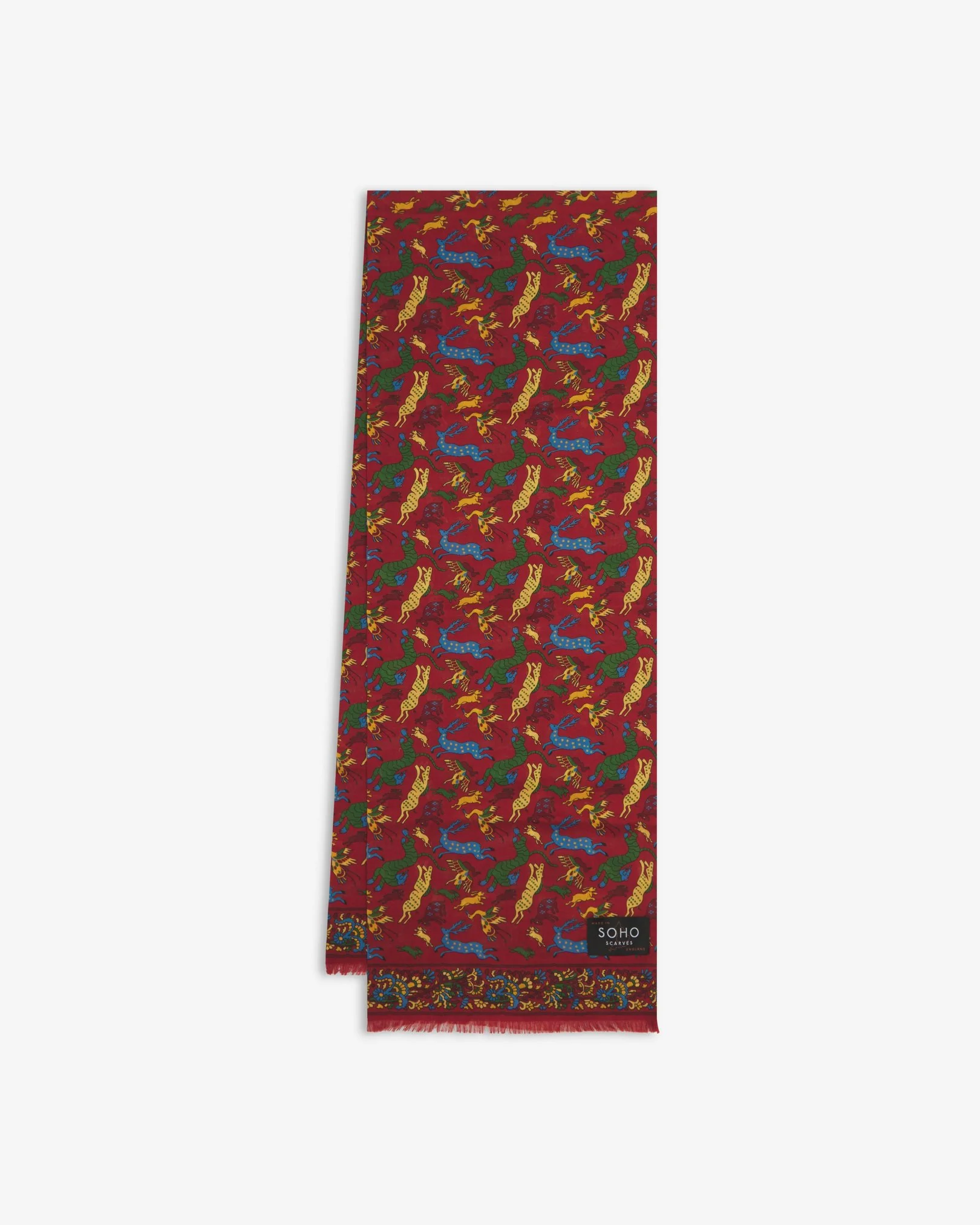 Our Copper Rust 'Woodland Creatures' silk-wool scarf for men belongs to our premium UK collection. Designed and printed in Macclesfield, England, our scarves draw on the exceptional talent of local silk dyers and printers.
