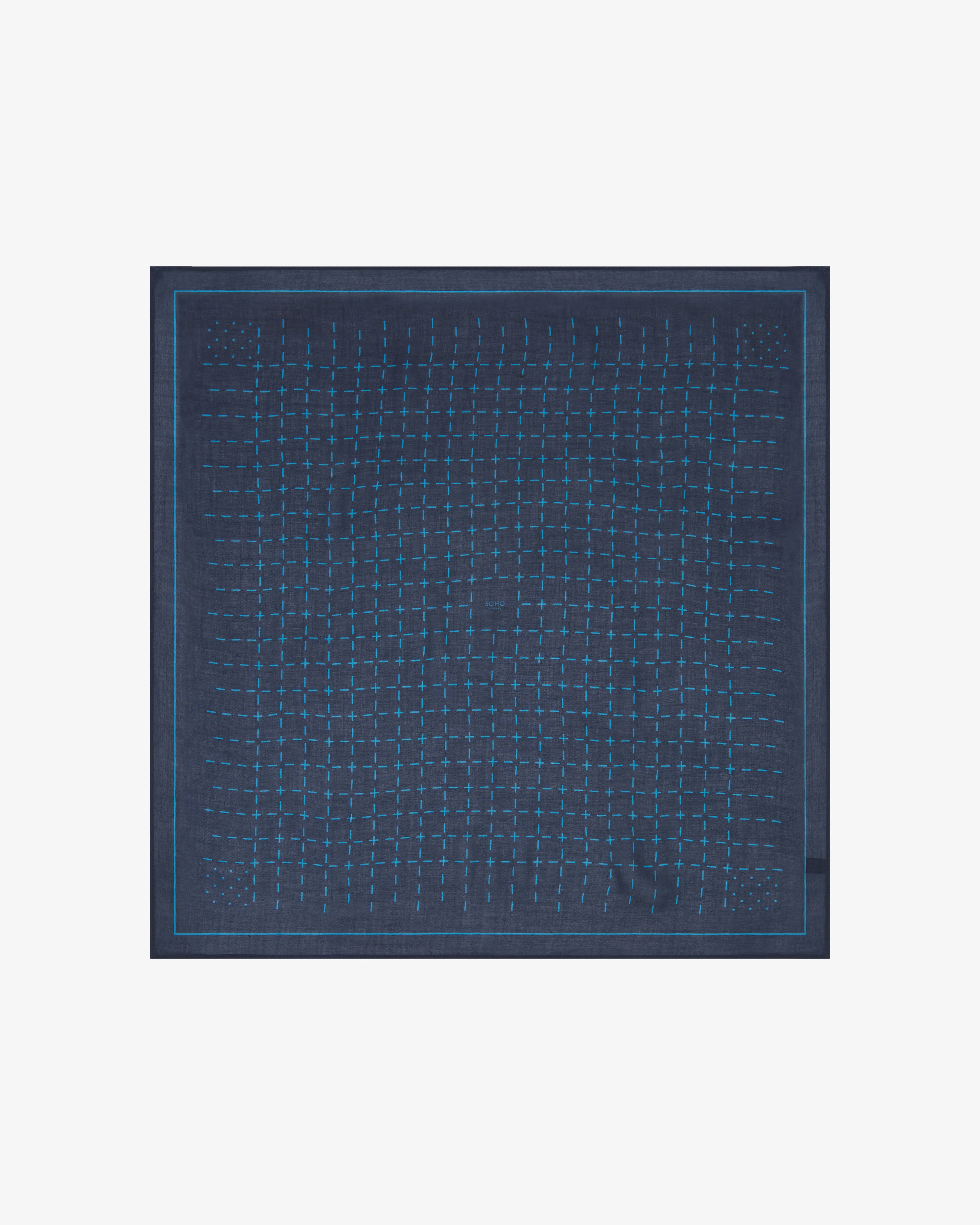 The 'Crosses in Blue' bandana features a navy blue base with a repeating pattern made up of light blue dashes and crosses. The design offers a clean, structured look, reminiscent of graph paper grid patterns.