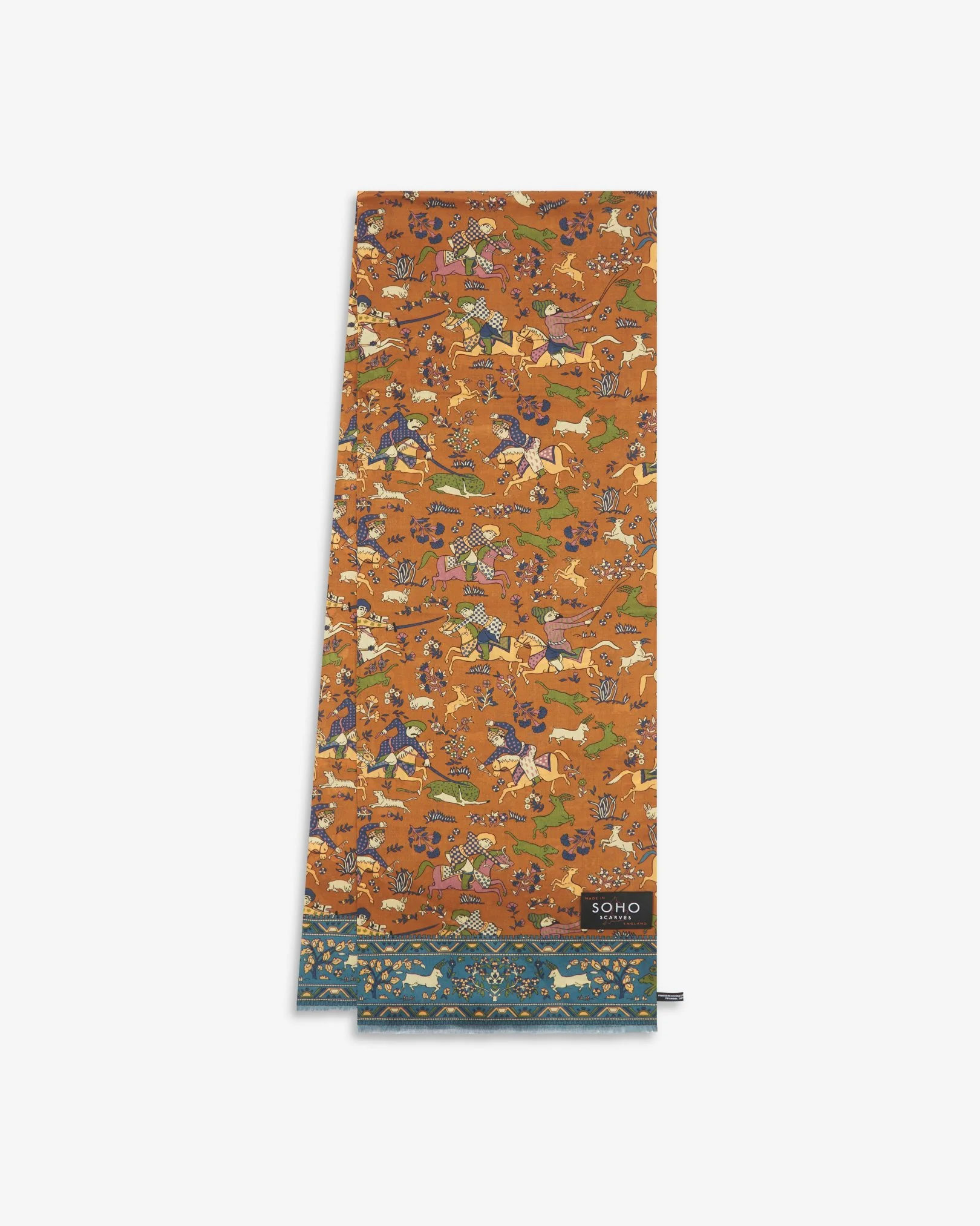 The meticulous production process of the ‘Hunters’ scarf achieves an immaculately detailed multicoloured design on a dull gold ground, combining ancient East Asian hunting motifs with matching floral border decoration.