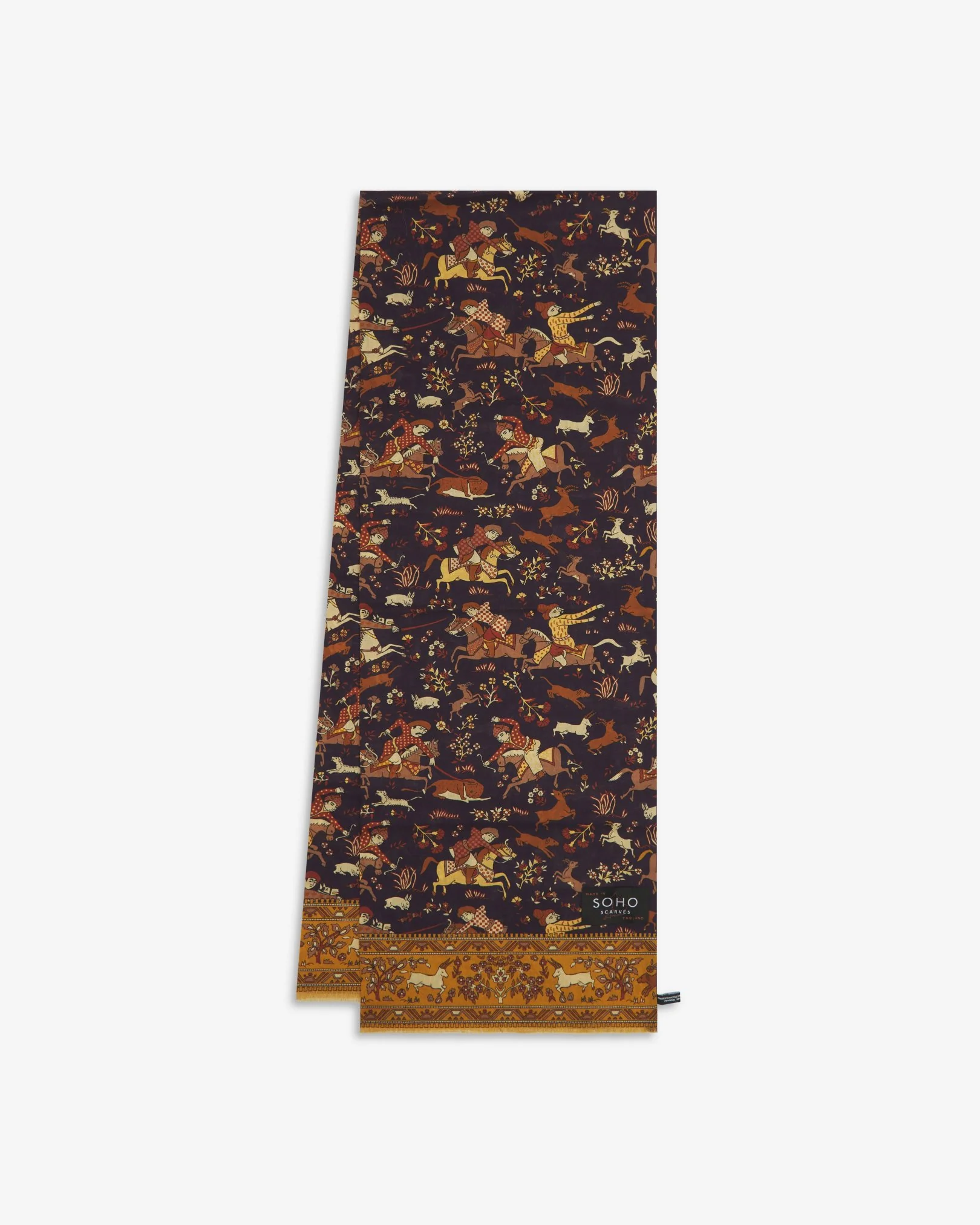 The meticulous production process of the ‘Hunters’ scarf achieves an immaculately detailed design of indigo blue with a with muted browns and yellows, combining ancient East Asian hunting motifs with matching floral border decoration.