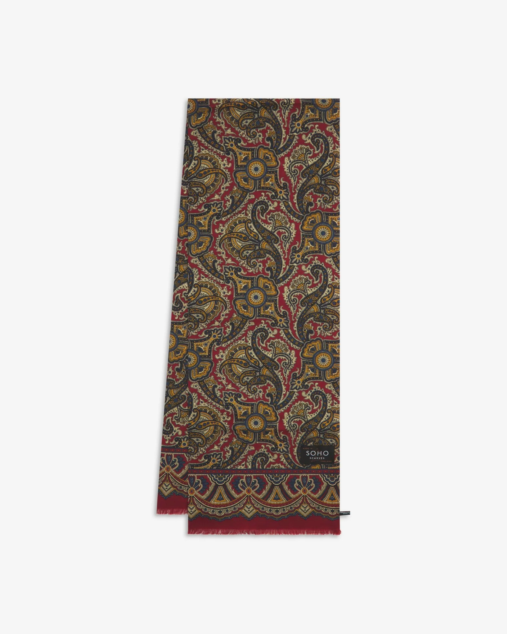 The meticulous production process of the scarf achieves an immaculately detailed design of paisley-inspired patterns comprising of reds, blues and yellows.
