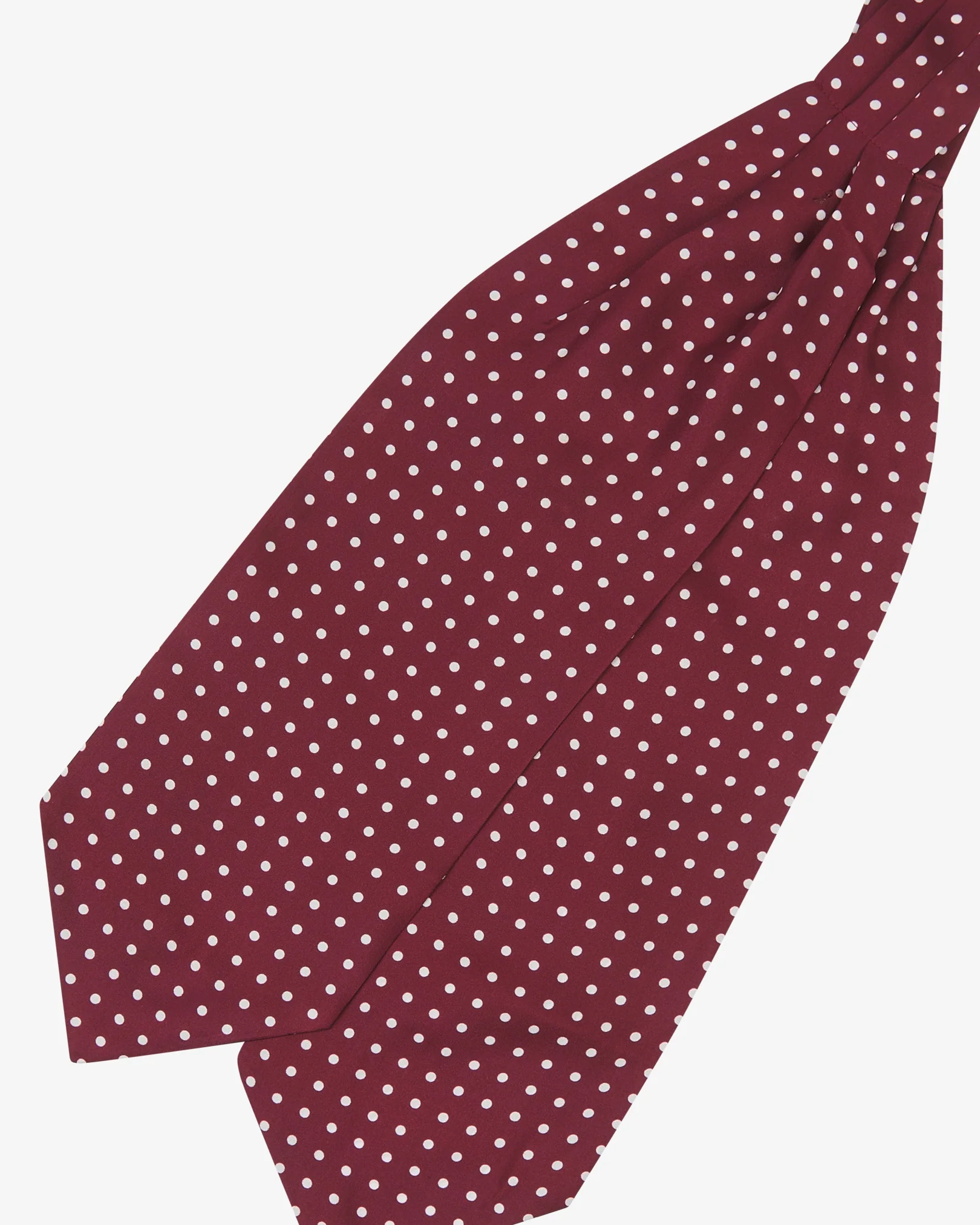 The ‘Sapporo Ascot’ burgundy silk tie for men has a classic white polka dot pattern which never goes out of style - a perfect addition to any wardrobe