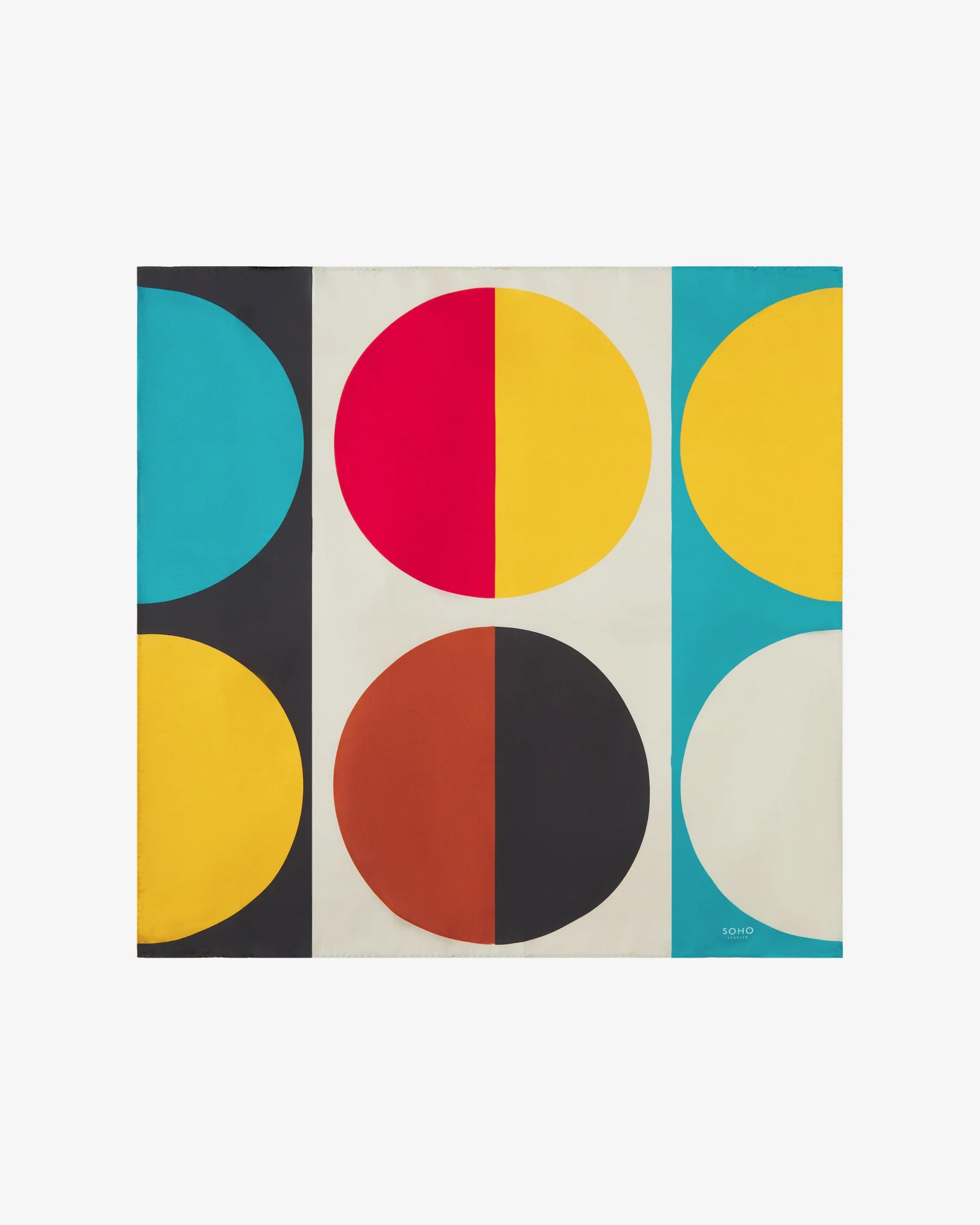 The charming interplay of semicircles over rectangular blocks combines the neutral colours of beige, brown and black with strong ochre-yellow, red-orange and turquoise-blue. The vibrant colours and disc shapes that characterise this striking geometric pattern result in a neckerchief both expressive and versatile with a stunning richness of contrasts.