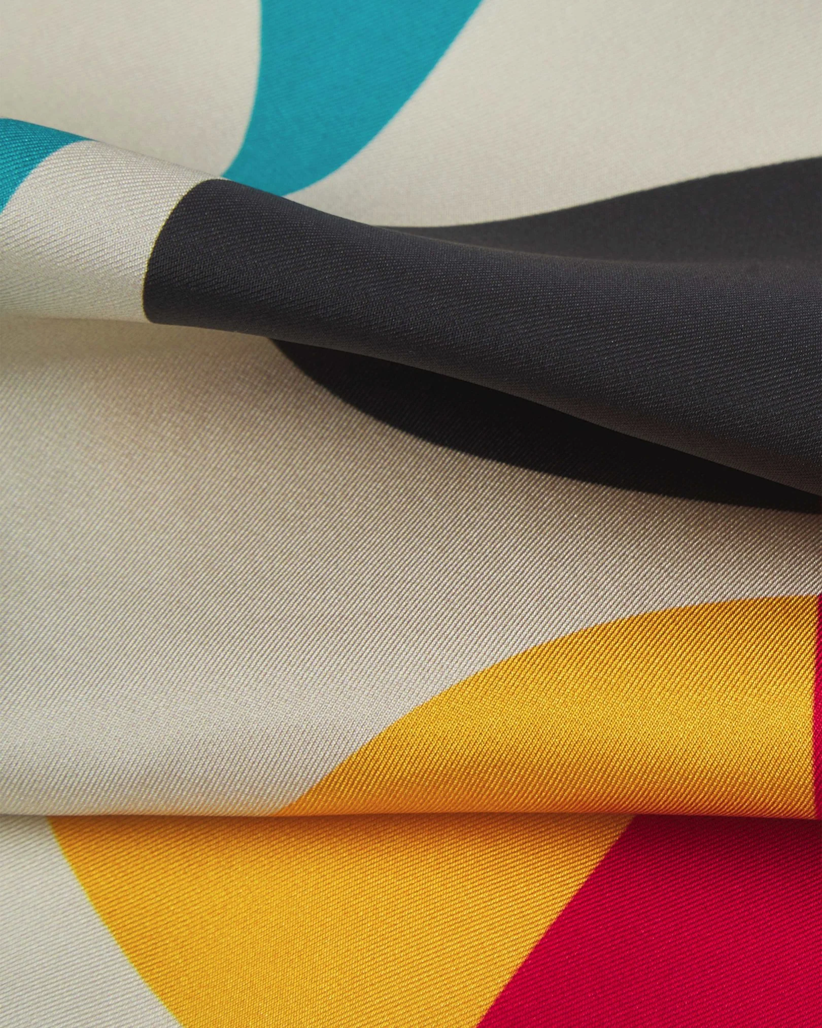 The charming interplay of semicircles over rectangular blocks combines the neutral colours of beige, brown and black with strong ochre-yellow, red-orange and turquoise-blue. The vibrant colours and disc shapes that characterise this striking geometric pattern result in a pocket square both expressive and versatile with a stunning richness of contrasts.
